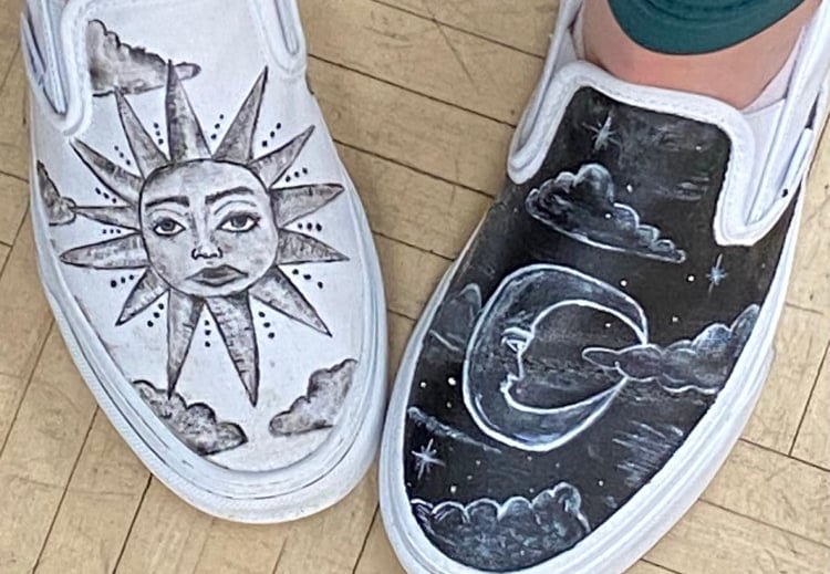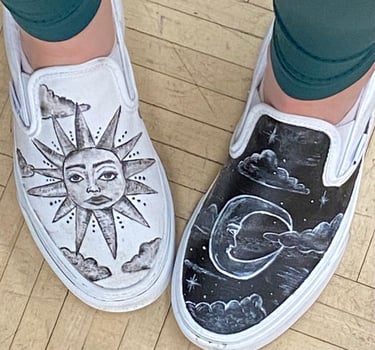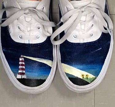 Un jour, mon amie m’a proposé de peinturer chacune une paire de souliers afin de représenter notre amitié. J’ai d'abord opté pour un phare illuminant deux tournesols nous représentant, elle et moi. Elle les a tellement aimés qu'elle m'en a demandé une autre paire peu de temps après! J'ai alors peint le soleil et la lune. L'acrylique a été utilisé pour donner une nouvelle vie à ses souliers.